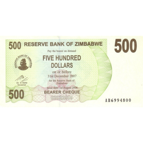 P43 Zimbabwe - 500 Dollars Year 2006/2007 (Bearer Cheque)