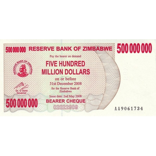 P60 Zimbabwe - 500.000.000 Dollars Year 2008/2008 (Bearer Cheque)